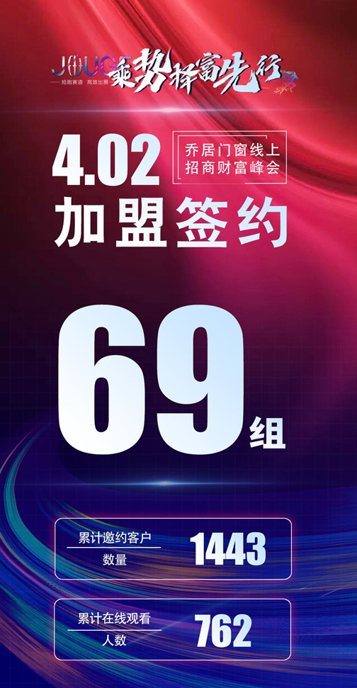 2023年4月2日,喬居門窗成功舉辦首屆線上招商財富論壇,以“乘勢 擇富 先行”為主題,吸引了全國各地千余名建材家居經(jīng)銷企業(yè)參與。在這場招商會上,喬居展現(xiàn)了卓越的品牌實力和產(chǎn)品魅力,一舉拿下69組簽約加盟,共同與各經(jīng)銷商探討財富增長的路徑,共筑美好未來。